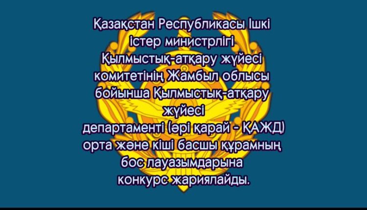 ​Қазақстан Республикасы Ішкі істер министрлігі Қылмыстық-атқару жүйесі комитетінің Жамбыл облысы бойынша Қылмыстық-атқару жүйесі департаменті (әрі қарай — ҚАЖД) орта және кіші басшы құрамның бос лауазымдарына конкурс жариялайды.
