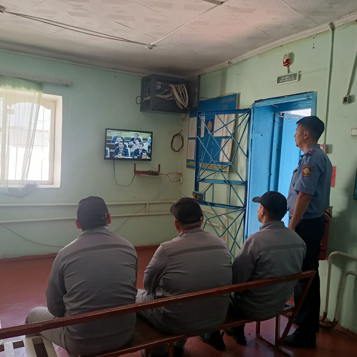 ҚАЖД №67 мекемесінде АКАТЖжӘП бөлімшесінің қызметкерлері 2023 жылдың 01 қыркүйегінде сағат 11-00 өткен Парламент палаталарының бірлескен отырысында Қазақстан Республикасының Президенті Қасым-Жомарт Токаев Қазақстан халқына жолдаудың тікелей трансляциясын шаруашылық жасағына қалдырылған сотталғандарға ұжымдық түрде көру ұйымдастырылды.