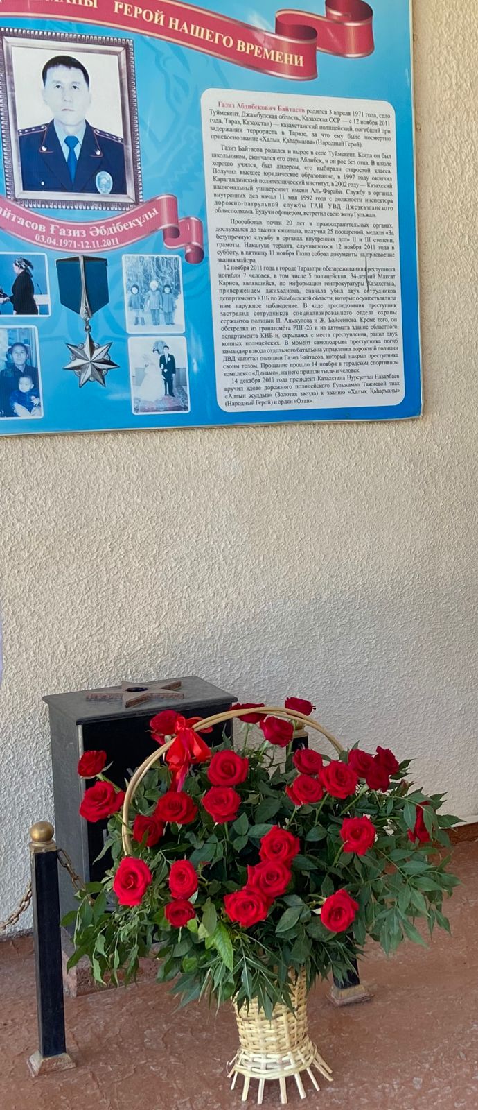 Жамбыл облысы бойынша ҚАЖД №67 мекемесі бастығының орынбасары әділет подполковнигі Тимур Қамбарұлы қызметкерлердің қызметке кірісу алдындағы нұсқаулықты “Ерлік – халыққа мұра, жас ұрпаққа ұран”- деп бастады, өз сөзінде Тараз қаласында 2011 жылғы 12 қарашадағы қанды оқиғада қаза тапқан Халық Қаһарманы Ғ.Байтасовты еске алып, сол күнгі шешуші сәтте «жаным арымның садағасы» деген Ғ. Байтасовтың сөздерін айтып мекеменің барлық қызметкерлерініне туған елін, жерін шексіз сүюге, Отан алдындағы Антына адал болуға, тарихын қастерлеуге және ұлттық патриотизм сезімін арттыру көзі ашық көкірегі ояу ұрпақ тәрбиелеу әрбір азаматтың міндеті екендігін айта кетті. Сонымен қатар мекеме аумағында орналасқан ерлік бұрышы Ғ. Байтасовтың бюстіне шоқ гүлдері қойылды.