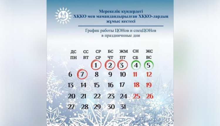 5 и 6 января все центры страны будут работать в обычном режиме. Так как 7 января в Казахстане празднуется православное Рождество, этот день для ЦОНов и спецЦОНов являются выходным.