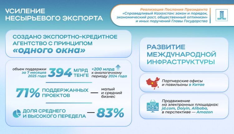 По поручению Главы государства создано Экспортно-кредитное агентство, предоставляющее полный спектр финансовых инструментов по принципу «одного окна». За 7 месяцев текущего года объем оказанной поддержки вырос более чем на 200 млрд тенге по сравнению с аналогичным периодом прошлого года и составил 394 млрд тенге. Особое внимание уделяется малому и среднему бизнесу, на который приходится 71% всех поддержанных проектов. При этом доля продукции среднего и высокого передела достигает 83%.