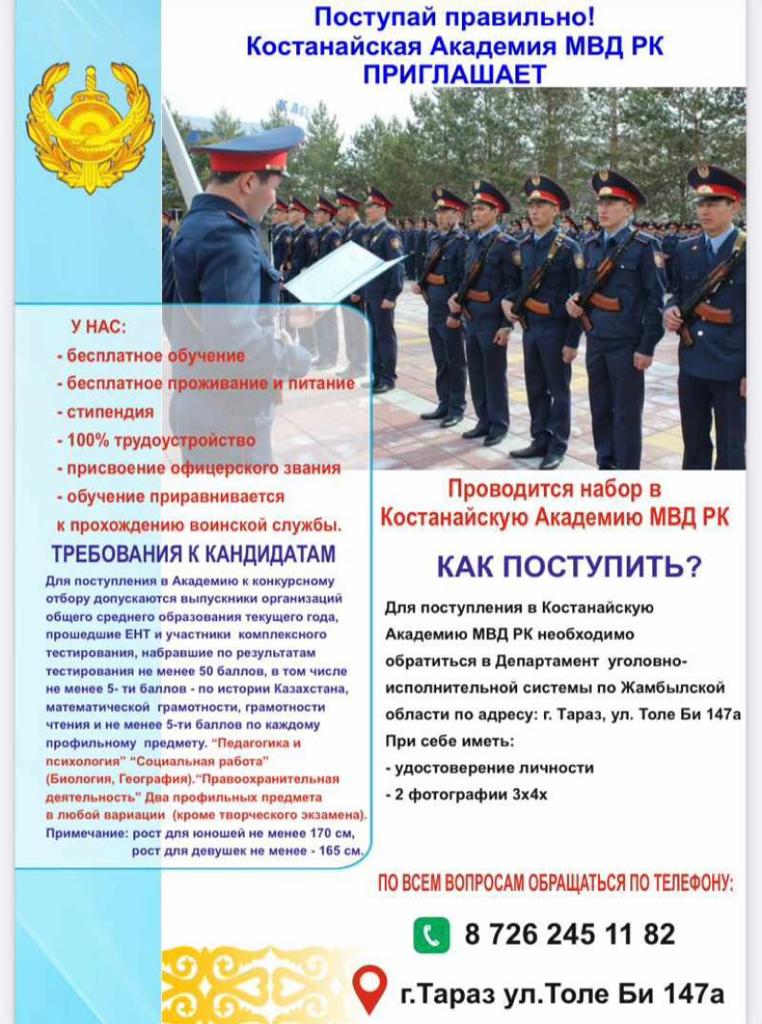 Жамбыл облысы бойынша ҚАЖД №67 мекемесінің тәрбие және кадр жұмысы қызметкерлерімен Жамбыл облысы Ю. Гагарин аудандық орта мектебінің 10-11 сынып оқушыларымен үгіт насихат жұмысы негізінде жиын өткізілді, жиын барысынды болашақ 2024 жас түлектерге ҚР ІІМ Ш.Қабылбаев атындағы Қостанай академиясына оқуға түсудің негізгі шарттары, дене шынықтыру нормалары түсіндіріліп, ҚР Құқық қорғау органдарының қызметкерлері болуға шақырды.