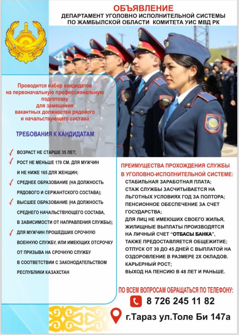 Қазақстан Республикасы Ішкі істер министрлігі Қылмыстық-атқару жүйесі комитетінің Жамбыл облысы бойынша Қылмыстық-атқару жүйесі департаменті (әрі қарай — ҚАЖД) орта және кіші басшы құрамның бос лауазымдарына конкурс жариялайды.